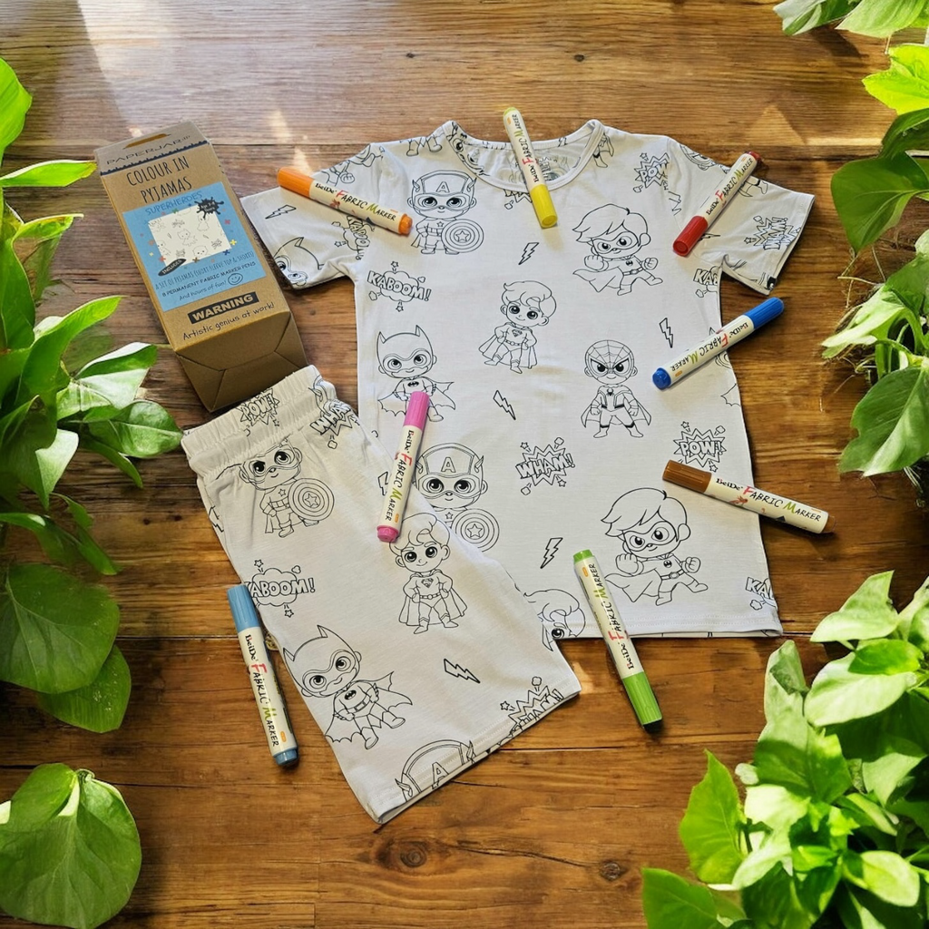 Let your little one's creativity shine with this fun Superhero themed colouring set of pyjamas!